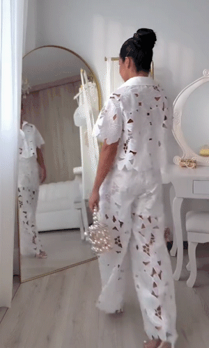 Stay stylish and comfortable in our delicate floral embroidered openwork lace top and wide-leg pants set. Made from premium fabric, this set is soft and breathable for all-day wear, and the loose fit ensures a comfortable fit.